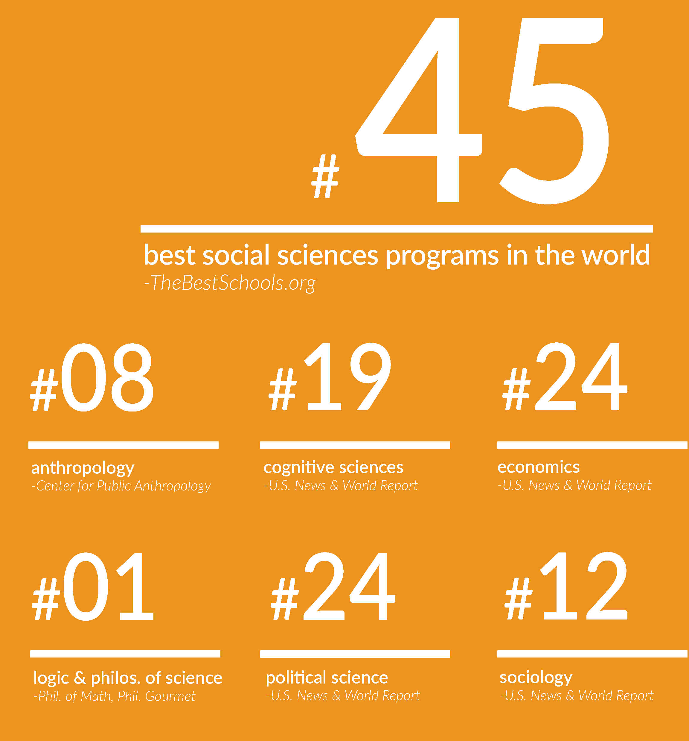 As a school, social sciences ranks 45th in the 2015 Academic Ranking of World Universities in Social Science, compiled by TheBestSchools.org.